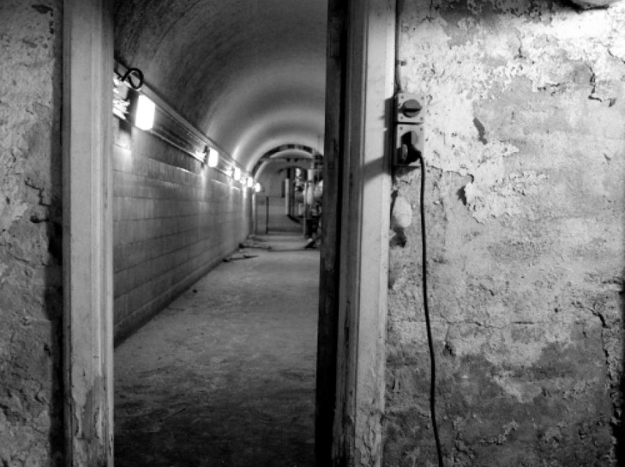 Tunnel med rundbuet loft og et kraftigt vandrør.