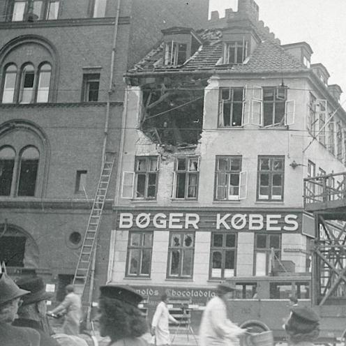 I november 1943 blev hovedkvarteret for National Socialistisk Parti spængt i luften. Derfor findes der ikke noget arkiv fra partiet i dag. NSP holdt til på hjørnet af Nørrevoldgade og Gothersgade. Foto: Frihedsmuseet.