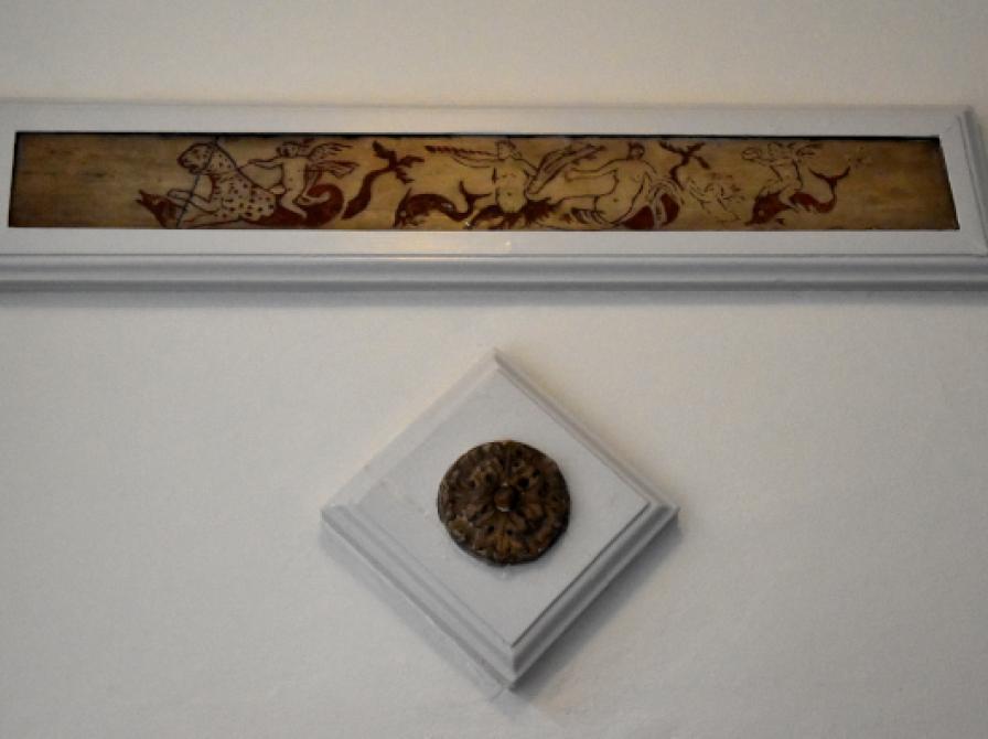 Marmorplade med forskellige havdyr. I midten ses havguden Triton. Hjembragt fra Tunesien.