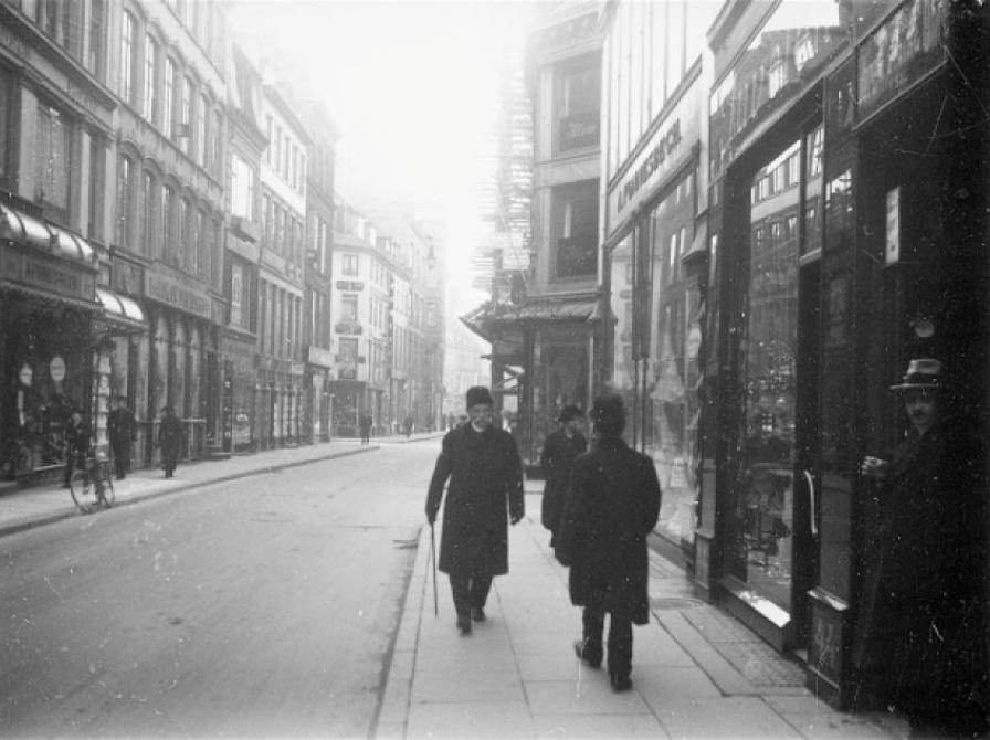 Sort hvid foto af gadeforløb Østergade. Foto: Paul Fischer/Kbhbilleder.dk, ca.1890 – 1930.
