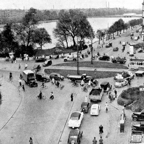 Og generalplanen er absolut værd at kende. Både for dens ideer, og for de mange fotoer. Især fordi den i bagklogskabens ubærlige klarsyn viser hvor uforudsigelig byudvilingen er. Se fx på nedenstående billede af Nørrebrogade, med billedteksten: "Nørrebrogade er den typiske cyklist- og sporvognsgade og kun få biler vover sig ud i vrimlen. I myldretimerne er den udnyttet til den yderste grænse (teleobjektivoptagelse, stærk forkortning)."