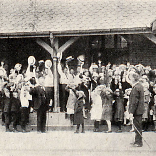 På to af fotoerne i bogen kan man se såvel ankomst som afgang. Mens ankomsten er noget formel med håndtryk, så ser afskedet meget festlig ud. Der vinkes med stråhatte. Og så vidt jeg kan se, må det være Lygten Station.