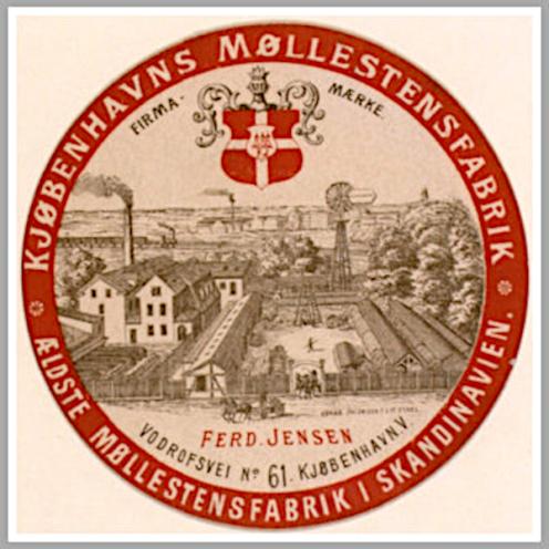 En nutidsdansker har ikke noget nært forhold til møllesten, andet end som klenodier i baghaver, men det er værd at dvæle ved en af de store pionerer indenfor branchen. Han hed Ferdinand Jensen (1844-1899) og grundlagde Københavns Møllestensfabrik i 1868. Virksomheden lå på Toldbodvej (i dag Esplanaden) og var berømt for sine kvalitetsprodukter. Han havde studeret i udlandet og havde specialviden om især franske og tyske møllesten. Han vandt priser, den ene efter den anden i Berlin, Malmø, København og Stockholm, og virksomheden flyttede til større forhold på Vodroffsvej.