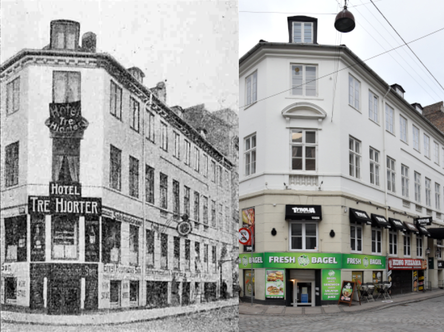 Vestergade 12, omtrent 1920 / 2021. Her lå den berømte gæstgivergård "Tre Hjorte". Nævnes som gæstegård i 1684. Tre Hjorte var på Holbergs tid et kendt herberg.