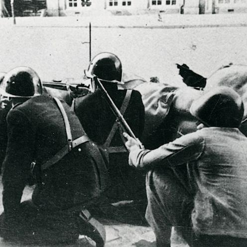 Danske politifolk i stilling før kampene ved Amalienborg. Foto: Frihedsmuseets fotoarkiv, 1944.