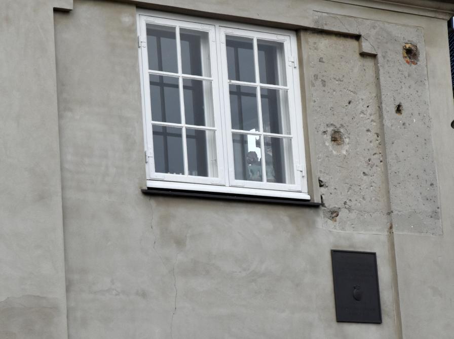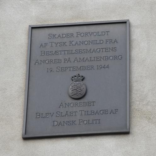 Teksten på tavlen: "SKADE FORVOLDT / AF TYSK KANONILD FRA / BESÆTTELSESMAGTENS / ANGREB PÅ AMALIENBORG / 19. SEPTEMBER 1944 /// [politiemblem] /// ANGREBET / BLEV SLÅET TILBAGE AF / DANSK POLITI"