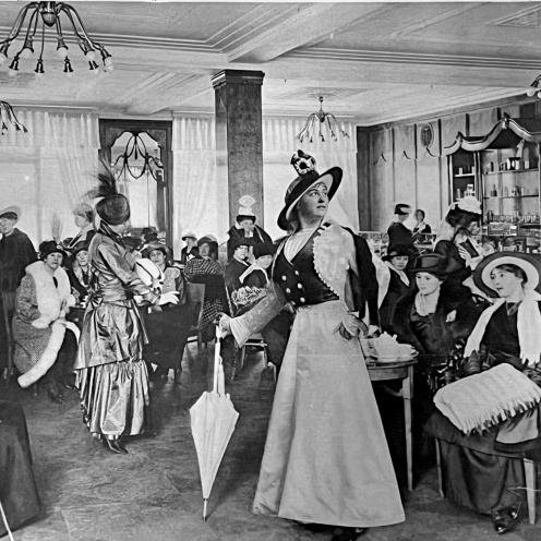 Stormagasinets mannequinopvisninger blev også afholdt i tesalonen. Gæsterne sad tæt og drak te og chokolade, mens mannequinerne snoede sig rundt om bordene, og fremviste den nye mode.