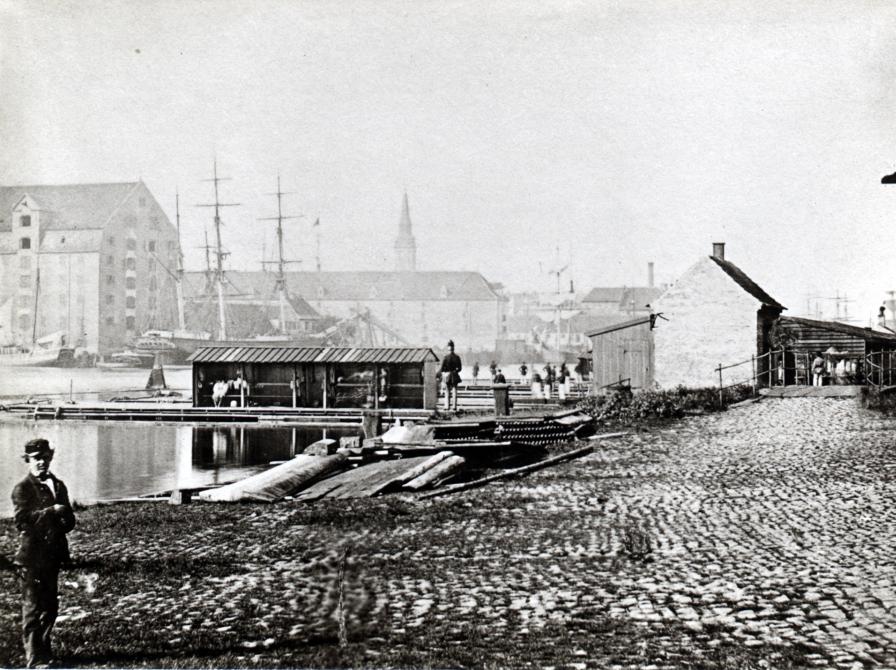 Gammelholm, badeanstalten ud for Smaløen. Den blev bl.a. benyttet af en del drengeskoler såvel som militæret. Foto: Kbhbilleder.dk, ca. 1863.