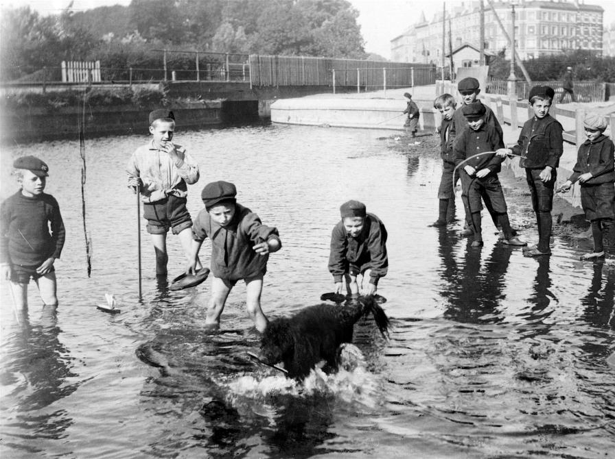 Ladegårdsåen. Drenge i leg med hund i åen. Foto: Orla Michael Bock/Kbhbilleder.dk, ca. 1907.