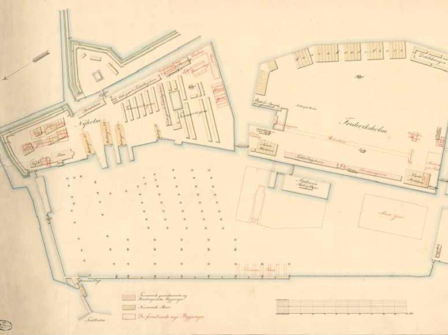 Kort af badebassinerne i flådens leje ses vinkelret på Hønsebroen, lige overfor Ankerøen. Kort: L. de Conninck/Stadsarkivet, 1836.