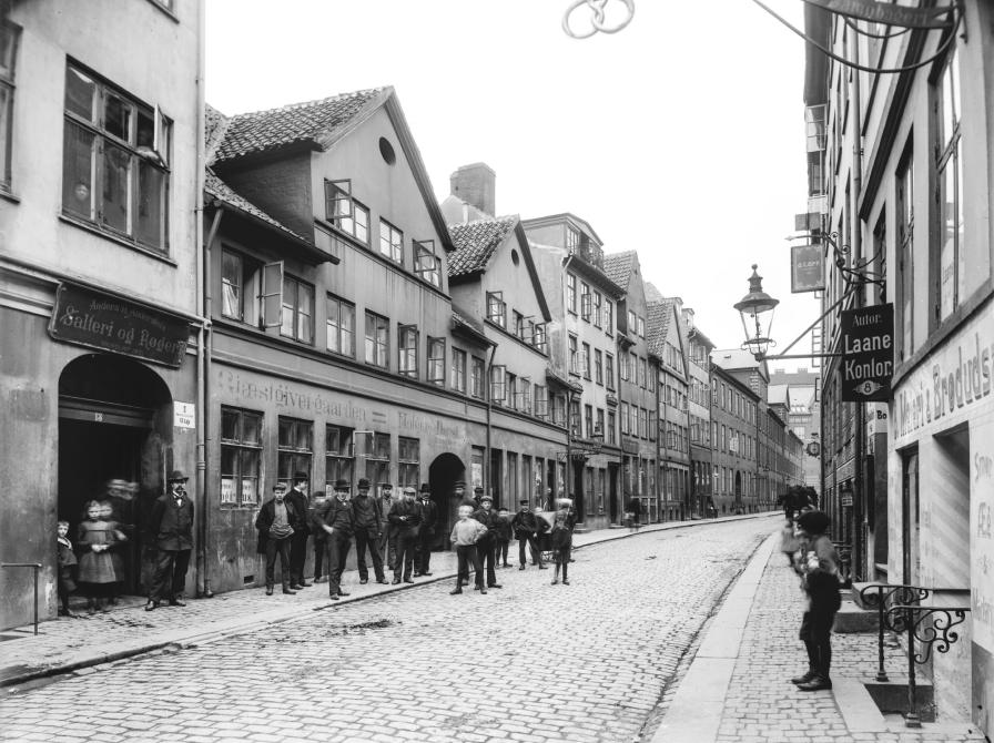 Han beskriver i bogen blandt andet kælderværtshuset Blodkoppen, der lå overfor det skumle logihus Holger Danske i Farvergade, der ses på billedet. Som flere andre steder var Blodkoppen egentlig hverken et værtshus eller et logihus. Det var en kælder, hvor der om natten blev rullet halmmåtter ud på gulvet, som gæsterne så sov på. Og det kunne nok være nødvendigt med et sted at sove rusen ud. For brændevinen var billig og drukkulturen intens.