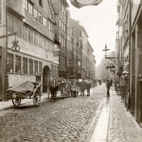 Vognmagergade, nordre ende, set mod Åbenrå. Foto: Johannes Hauerslev/Kbhbilleder.dk, ca. 1895.