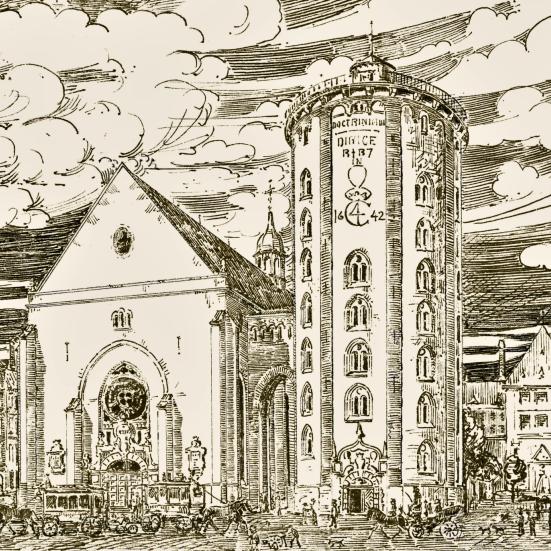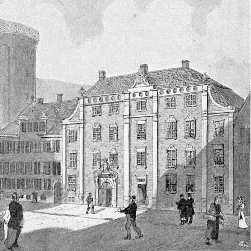 "Af alle Bygninger på Store Købmagergade var "Den kongelige Porcelænsfabrik", om ikke den ældste, saa dog den stilfuldeste - med Rundetaarn til Fløjmand gav den ligefrem Gaden Karaktér. Til højre havde den Vaisenhuset, til venstre den gamle Bryggergaard, hvor Studenterforeningen havde sit første Lokale".