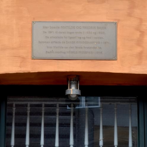 "Her boede MATILDE OG FREDRIK BAJER / fra 1871 til deres dages ende (i 1934 og 1922). / De arbejdede for ligestilling og fred i verden. Sammen stiftede de DANSK KVINDESAMFUND I 1871, / hvor Matilde var den første forstanderske. / Fredrik modtog NOBELS FREDSPRIS i 1908."