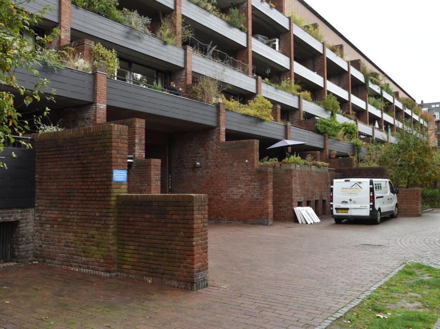 "Mod gården aftrapper bebyggelsen for til sidst at glide over i lave brystningsmure, der danner små rum med bænke. På denne måde bliver bygningens bærende struktur meget opfattelig og vedkommende. Imellem gårdfacadernes lodrette murskiver er der store vandrette glaspartier og træbeklædte terrasser. Terrasserne er frodigt beplantet, og med deres karakter af hængende haver bidrager de til et åbent og levende gårdmiljø:"