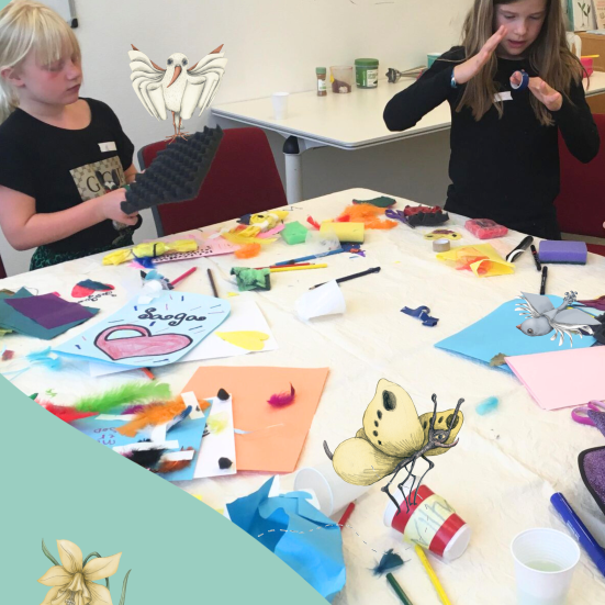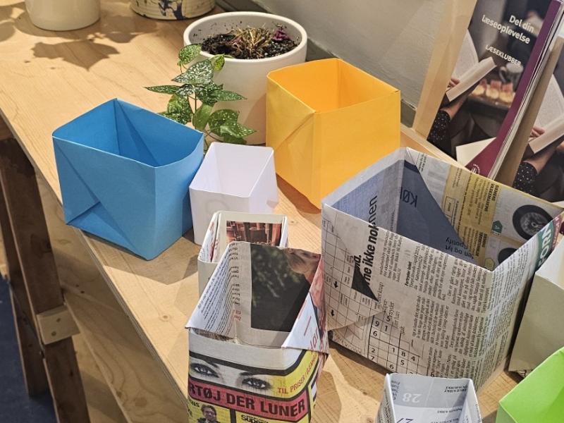 Vi folder papirpotter, planter stiklinger og navngiver dem efter forfattere og kendisser. Så stiller vi dem frem som gaver til bibliotekets brugere i bibliotekets planteafdeling.