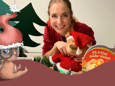 Karina Nielsen fra Teater AstaBasta byder børn og voksne indenfor til juleforestillingen BamseJul.Brønshøj Bibliotek