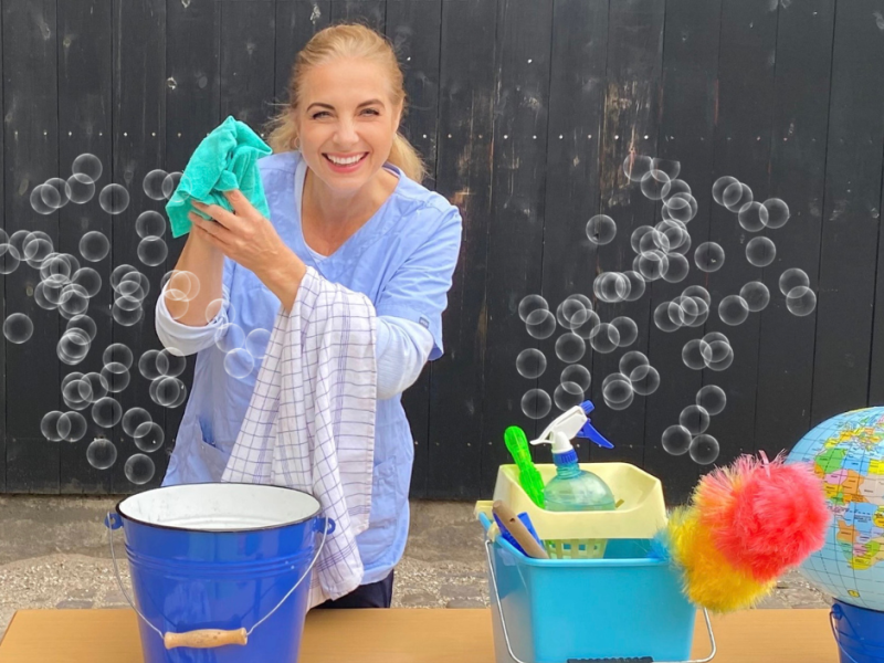 Historien bliver fortalt med spande, børster, klude, sæbebobler og musik.