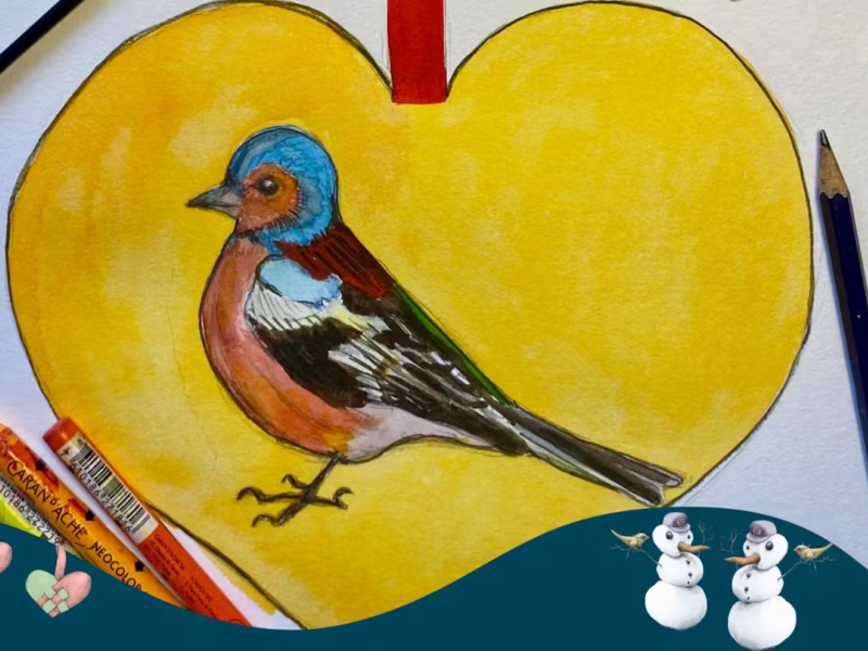 Med blyant, vandfarver og tusch skaber vi sammen de fineste fugle, der kan flyve med hjem i stuerne og gøre vinteren smukkere.