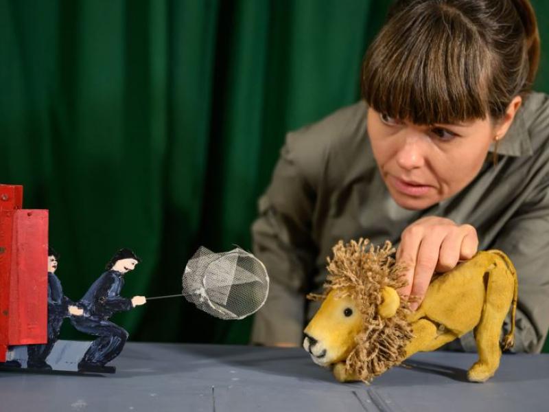 En varm og vittig dukketeaterforestilling for de små, bygget på Louise Fatios bog Den Glade Løve