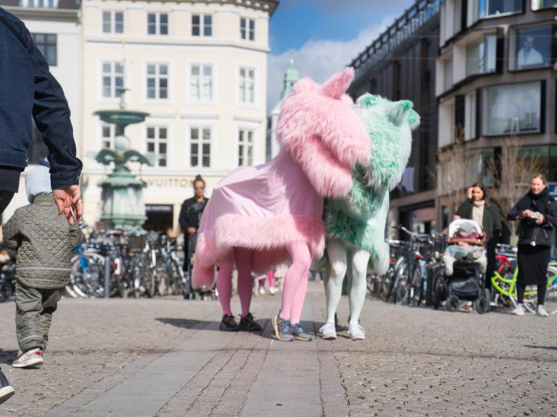 ENHJØRNINGERNE er en levende og legende performance, hvor to store, pelsklædte enhjørninger i pastelfarver dukker op – dansende, galopperende og vibrerende af energi.