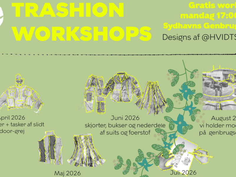 Trashion-workshoppen afholdes på Sydhavn Genbrugscenter i samarbejde med designprojektet HVIDTSKRALD, som har designet genbrugstøj til bl.a. musikeren Katinka (se mere om designprojektet HVIDTSKRALD på deres instagram-side her).